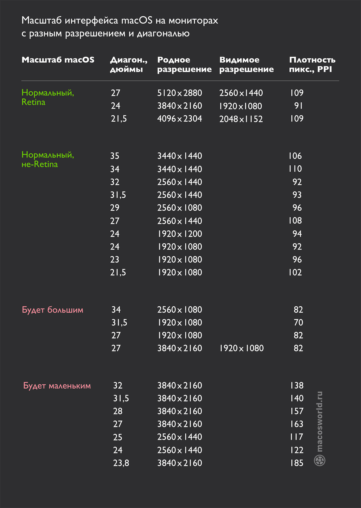 Некоторые из лучших вариантов, которые вполне доступны по цене и обеспечивают четкое и качественное изображение, — это мониторы с разрешением 2560x1440 пикселей и диагональ экрана, равна 27 дюймам. Их доступность не является проблемой, потому что на рынке есть очень много моделей, разработанных различными брендами соответственно по разным ценам, но которые все же будут близки к качеству Apple. Для людей, которые хотят немного сэкономить, идеальный вариант - 21-дюймовый и с разрешением 1920x1080 пикселей.