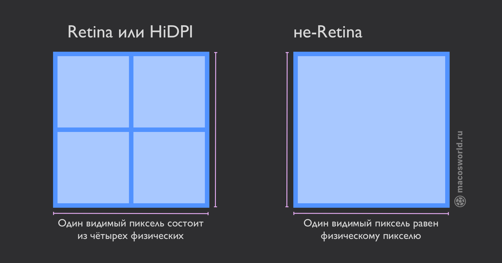 Retina — это когда видимый пиксель равен 4 физическихи, таким образом, позволяет сохранять четкие изображения и размеры для удобства использования.